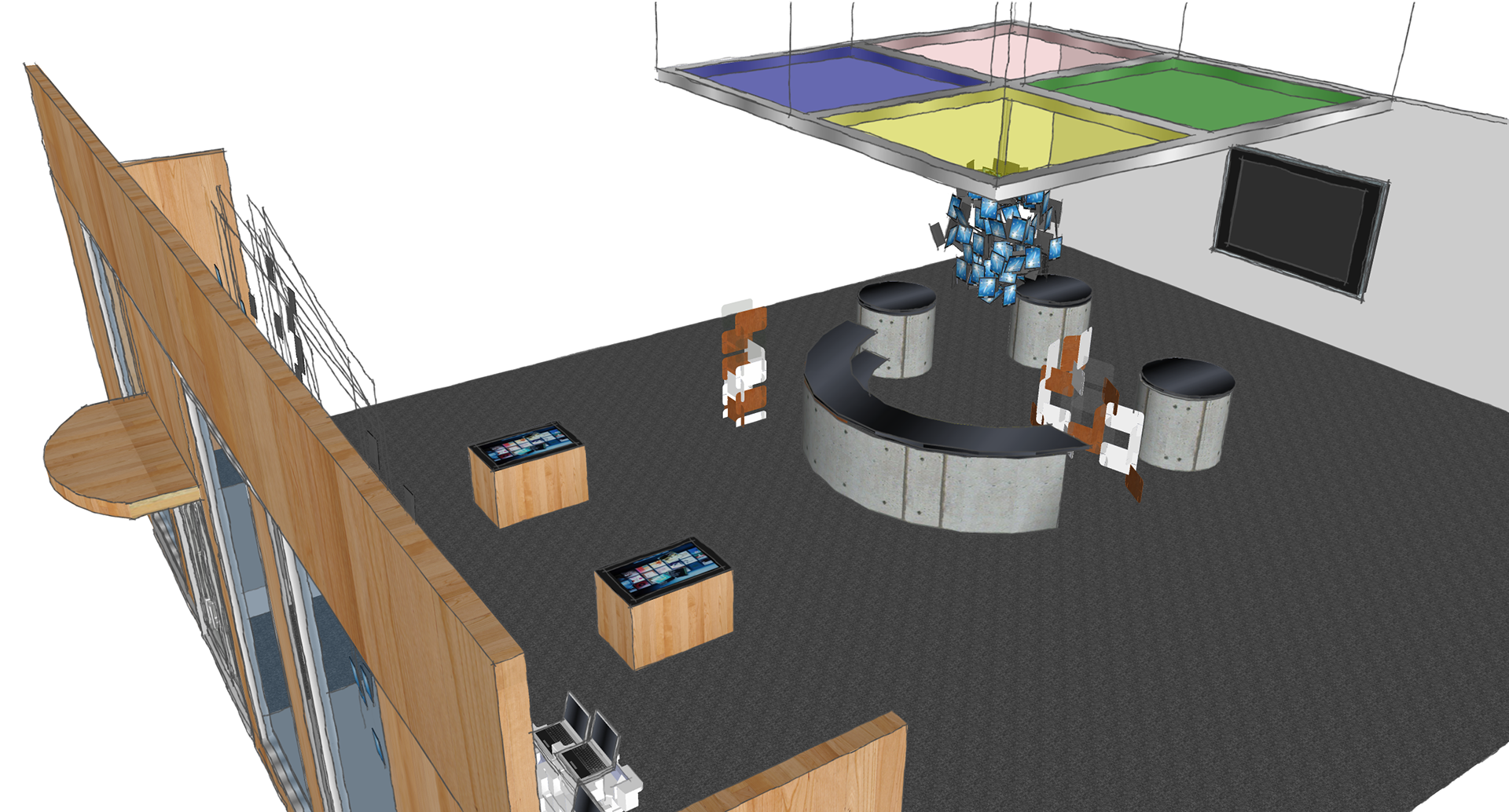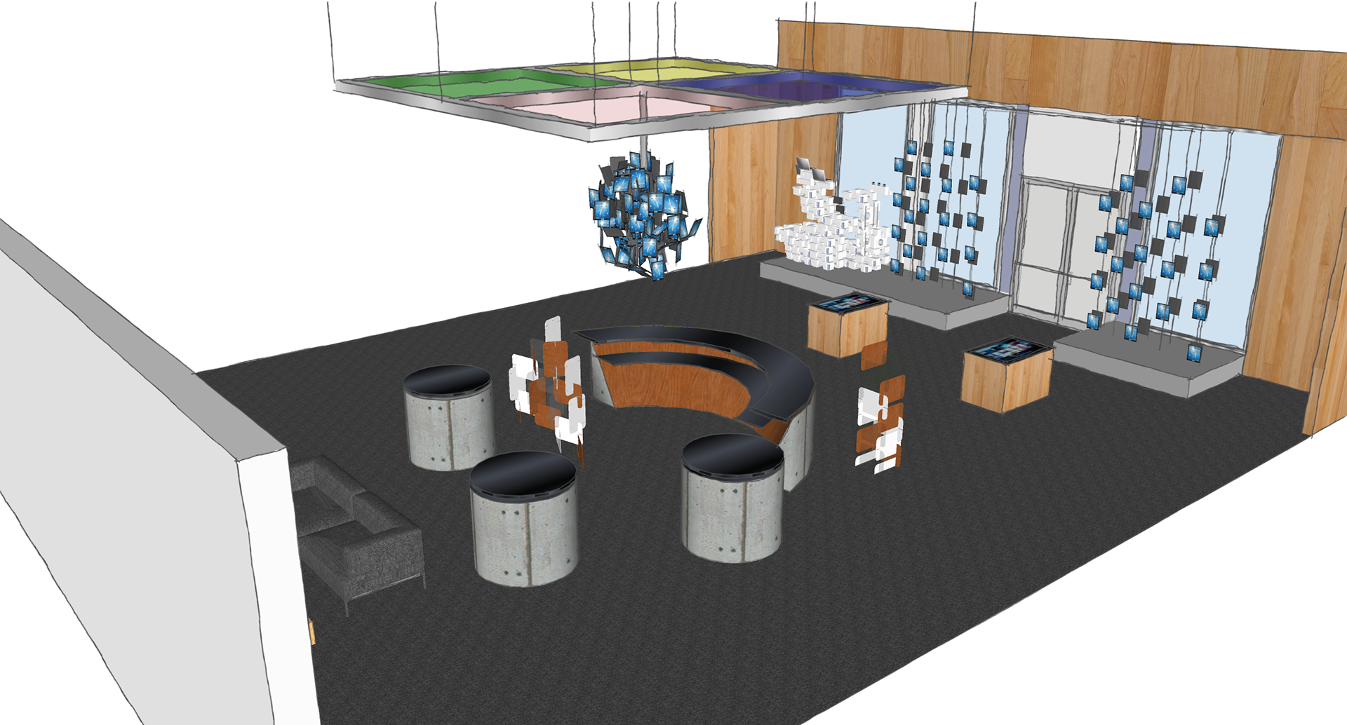 Environmental design for the on campus Retail Experience Center. Main function is to present to third party retailers, test consumer behaviors, wayfinding, and promotional launches.